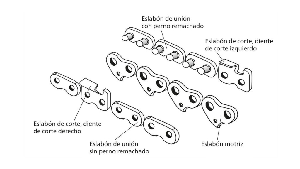 Una cadena de motosierra consta de eslabones de corte, eslabones motrices y eslabones de unión.