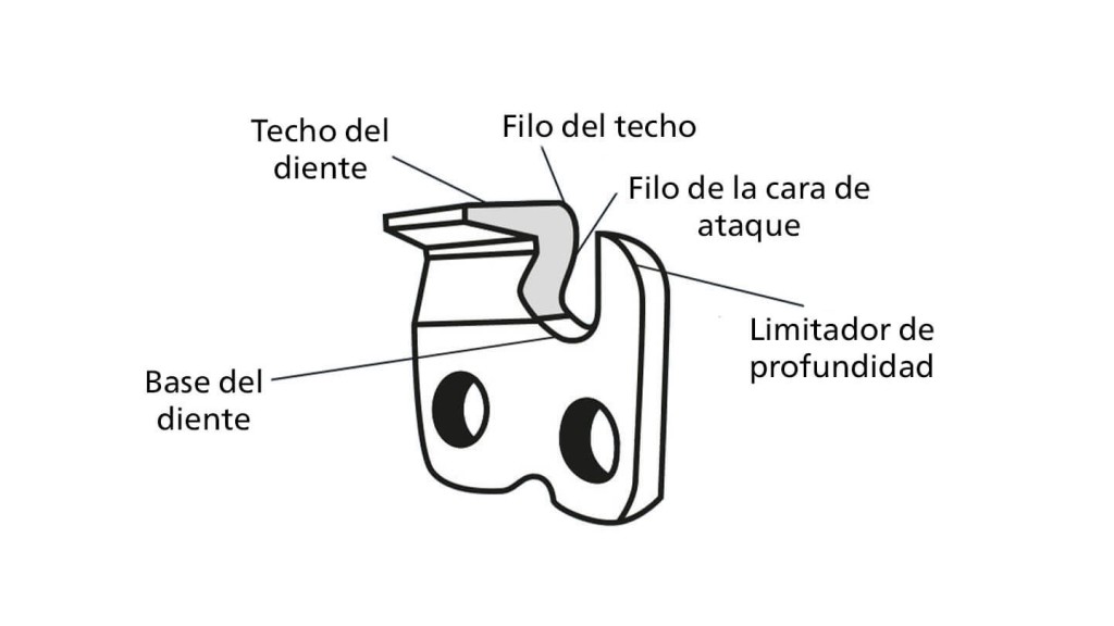 A su vez, el limitador de profundidad se encuentra delante del diente de corte y tiene la función de limitar la profundidad de penetración en la madera.