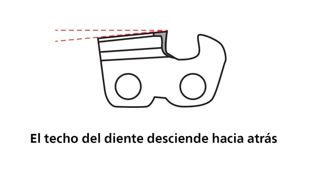 En el caso del diente con perfil tipo cincel, el filo de la cara de ataque y el filo del techo forman una punta afilada. Comparado con el diente con perfil tipo semicincel, presenta menos resistencia al corte, lo que contribuye a un mejor rendimiento de corte. Esto hace que sea el más popular entre los profesionales. El afilado del diente con perfil tipo cincel requiere práctica y una ejecución muy precisa.