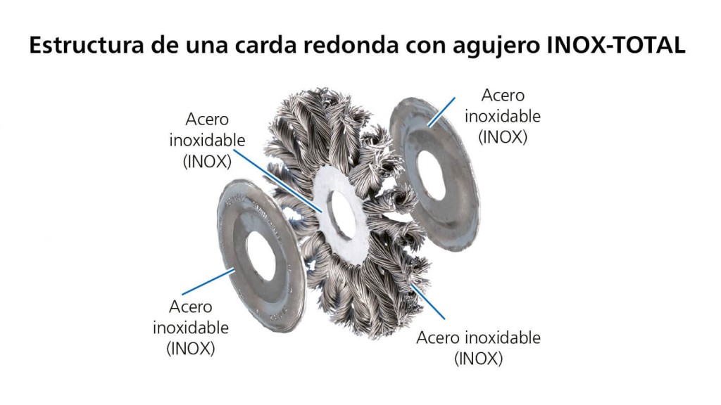 Para el mecanizado de acero inoxidable (INOX), además de cardas con cerdas de acero inoxidable, PFERD TOOLS ofrece también cardas de la ejecución INOX-TOTAL.