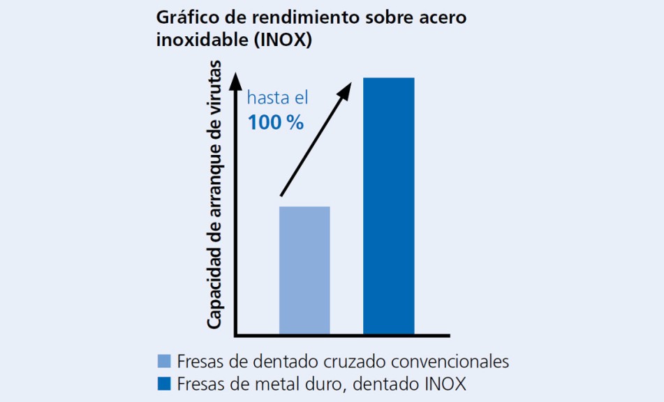 Además, en comparación con las fresas de corte cruzado convencionales, el dentado INOX obtiene hasta un 100 % más de arranque de material cuando se utiliza sobre acero inoxidable.
