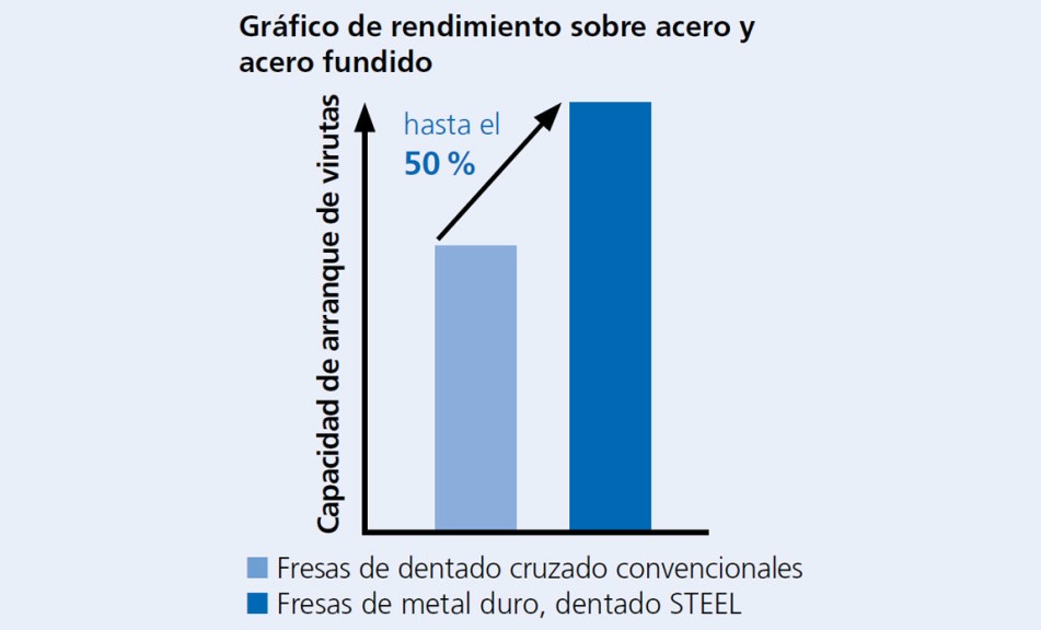 En comparación con las fresas de corte cruzado convencionales, el dentado STEEL se caracteriza por hasta un 50 % más de arranque de material cuando se usa sobre acero y acero fundido.