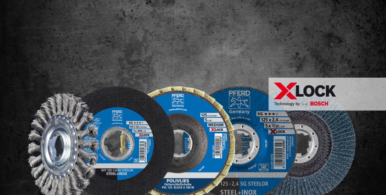 X-LOCK de Bosch es el primer sistema de cambio rápido del mundo para amoladoras angulares: basta con colocar la herramienta en el soporte X-LOCK y hacer clic en él. Nunca ha sido tan fácil cambiar la herramienta en una amoladora angular. El X-LOCK crea un nuevo estándar que hace el trabajo sea más fácil para el profesional aumentado además la productividad. Bosch Power Tools ha confiado en socios fuertes como PFERD TOOLS participando en el desarrollo del sistema de anclaje X-LOCK para abrasivos con aglomerante, discos de láminas lijadoras y cardas, además de generar los medios necesarios para su fabricación industrial.