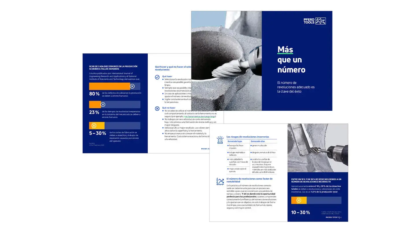 El número de revoluciones correcto es esencial para la productividad de sus procesos, ya que incluso pequeñas desviaciones del rango de revoluciones óptimo pueden tener un gran impacto en el rendimiento, el resultado del mecanizado y la vida útil de la herramienta. En nuestro libro blanco exclusivo, descubrirá cómo aumentar su productividad, la seguridad de los procesos y la vida útil en unos pocos pasos. Regístrese ahora para recibir su libro blanco gratuito.
